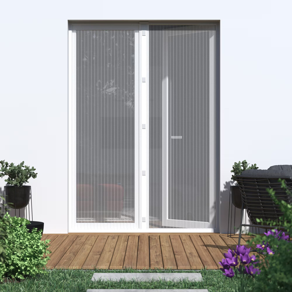 Schiebbarer Insektenschutz für Glasflächen zwischen Türen.